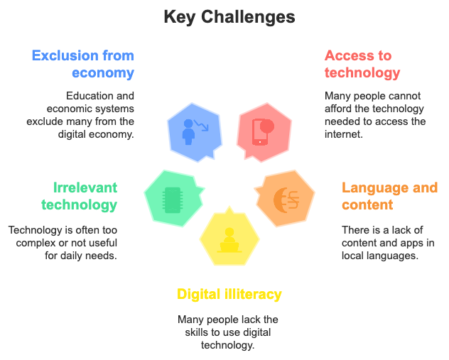 • Digital illiteracy, especially among the elderly, women in rural areas, small business owners, and marginalized communities.